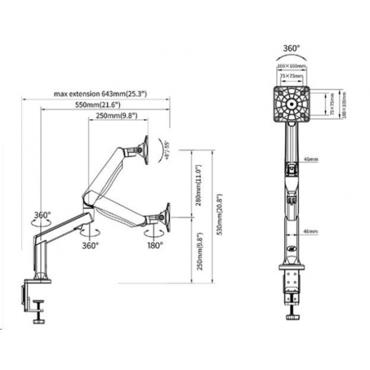 Profesionální stolový plně polohovatelný držák na monitory a televizory s úhlopříčkou 17-32" Nabízíme Vám špičkový držák na televizi nebo monitor s uchycením na stolovou desku, který je plně polohovatelný - otáčení do stran, nastavení náklonu, výšky a vzdálenosti od uchycení, otáčení obrazovky do horizontální nebo vertikální polohy. Držák je ideální pro zavěšení všech typů televizorů a monitorů s úhlopříčkou 17-32" a hmotností maximálně 8kg. Nastavení výšky umožňuje plynová pružina, kterou snadno nastavíte na hmotnost 2-8kg. Polohování obrazovky je velmi snadné a příjemné, zvládnou to i děti. Držák má systém pro vedení kabeláže a připojení USB portů. Barevné provedení černé. Záruka 3 roky. Technické údaje: nosnost 8kg minimální zatížení 2kg držák podporuje VESA standardy 75x75 a 100x100 možnost zakoupení rozšíření na VESA 200x100 nebo 200x200 ideální pro zavěšení monitorů a televizorů s úhlopříčkou 17-32" otáčení do stran +/- 180° náklon + 55° až - 8° funkce PIVOT - otočení obrazovky na délku nebo na výšku (horizontálně nebo vertikálně) nastavení vzdálenosti od uchycení na stolovou desku max. 643mm výškové polohování 280mm minimální výška od stolu 250mm maximální výška od stolu 530mm systém vedení kabeláže 2x USB port 2 typy uchycení na stolovou desku (na okraj, do prostoru) uchycení na stolové desky o síle 10-95mm profesionální kvalita barevné provedení černé záruka 3 roky.