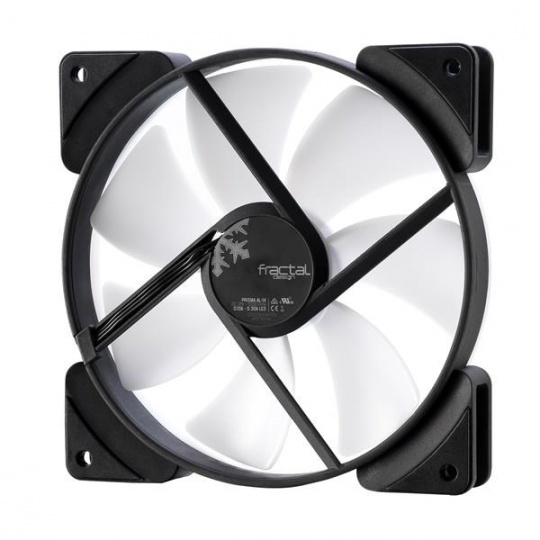 Tichý PC ventilátor Fractal Design Prisma AL-14 ARGB PWM so 6 RGB LED diódami, polopriehľadnými bielymi lopatkami ventilátora a bielym prstencom vytvára rovnomernú žiaru po celom povrchu ventilátora.
