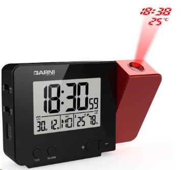 Digitálny budík s projekciou času a vnútornej teploty s LCD displejom, časom riadeným rádiovým signálom DCF-77 a meraním vnútornej teploty a relatívnej vlhkosti LCD displej o rozmere 63 x 42 mm s možnosťou stálého osvetlenia pri napájaní sieťovým adaptérom, alebo krátkodobým osvetlením na 8 s pri napájaní batériami 3 stupne jasu osvetlenia displeja, možnosť vypnutia osvetlenia displeja (pri napájaní sieťovým adaptérom) veľkosť číslic na displeji – čas 25 mm, dátum, skratka názvu dňa, vnútorná teplota a rel. vlhkosť 8,5 mm čas a dátum riadené signálom DCF-77 s možnosťou manuálneho nastavenia ikona príjmu signálu DCF-77 skratka názvu dňa 12-hodinový alebo 24-hodinový formát zobrazenia času možnosť nastavenia časového pásma od -12 do +12 hodín budík s 2 budícími časmi s funkciou opakovaného bdenia (Snooze) po 5 minútach budící signál - 10 sekúnd 1 pípnutie za sekundu, 10 sekúnd 2 pípnutia za sekundu, 10 sekúnd 4 pípnutia za sekundu a potom stály pípací zvuk projekcia času a vnútornej teploty s možnosťou otočenia obrazu o 180°, možnosť sklopenia tubusu projektora o 90° dopredu a dozadu farba projekcie červená stále projekcie pri napájaní sieťovým adaptérom s možnosťou vypnutia zobrazenie hodnôt vnútornej teploty a relatívnej vlhkosti zobrazenie teploty vo °C, alebo °F USB port na nabíjanie mobilných zariadení (len pri napájaní hlavnej jednotky sieťovým adaptérom), maximálny nabíjací prúd 1 000 mA napájanie sieťovým adaptérom, alebo batériami možnosť postavenia farba čierna Obsah balenia: 1 x digitálny budík GARNI 140 1 x sieťový adaptér český, slovenský, nemecký, anglický, taliansky, poľský a maďarský návod