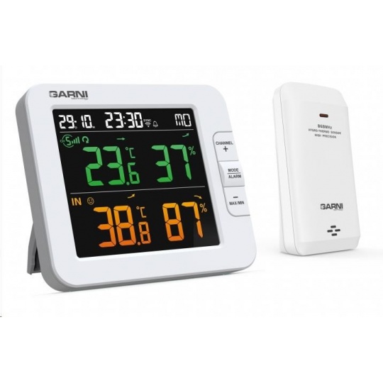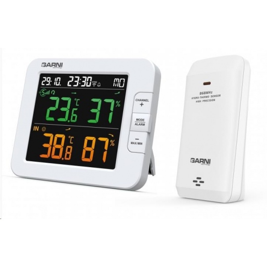 Chytrý viackanálový teplomer s vlhkomerom, model GARNI 419T má vstavaný modul WiFi a prostredníctvom svojho chytrého systému je kompatibilný s platformou Tuya IOT. Pomocou aplikácie Tuya Smart môžete sledovať teplotu a relatívnu vlhkosť hlavnej jednotky a bezdrôtových čidiel, kontrolovať históriu záznamov, nastavovať alarmy pre dané veličiny, spúšťať pokročilé funkcie za pomocou nameraných hodnôt a nameraná dáta odoslať na email v Excel súbore. Je možné ho prepojiť s ďalšími produktmi chytrej domácnosti, ovládanie potom prebieha cez aplikáciu v mobilnom zariadení. Hlavná jednotka aj bezdrôtové čidlo sú osadené švajčiarskymi čidlami SENSIRION. TUYA spolupracuje s platformou pre chytrú domácnosť Tuya pripojenie k miestnej Wi-Fi sieti 2,4 GHz spolupracuje s aplikáciou Tuya Smart jazykové mutácie aplikácie - čeština, slovenčina, angličtina farebný inverzný LCD displej o rozmeroch 90 x 81 mm stále osvetlený displej, 2 stupne jasu, nastavenie kontrastu v 15 úrovniach veľkosť číslic na displeji – čas 9 mm, dátum, skratka názvu dňa 7,5 mm, teplota 21,5 mm, relatívna vlhkosť 21 mm farby na displeji – čas, dátum, skratka názvu dňa biela, vnútorná teplota a rel. vlhkosť oranžová, vonkajšia teplota a rel. vlhkosť zelená meranie vnútornej a vonkajšej teploty a relatívnej vlhkosti zobrazenie teploty vo °C, alebo °F švajčiarska čidla SENSIRION možnosť použiť až 7 bezdrôtových čidiel (GARNI 055H, bazénové čidlo GARNI 057P) indikácia vnútornej tepelnej pohody 3 ikonami možnosť kalibrácie teploty a rel. vlhkosti vo vnútri i na jednotlivých kanáloch bezdrôtový prenos hodnôt vonkajšej teploty a relatívnej vlhkosti na frekvencii 868 MHz ikona sily signálu z bezdrôtových čidiel ikona pripojenia k miestnej Wi-Fi sieti pamäť na maximálne a minimálne namerané denno a celkové hodnoty teploty a relatívnej vlhkosti šípka vývoja teploty a rel. vlhkosti čas a dátum riadené z internetu s možnosťou manuálneho nastavenia budík s možnosťou opakovania bdenia (Snooze) po 5 minútach budicí signál - 4 sekundy 1 pípnutie za sekundu, 4 sekundy 2 pípnutia za sekundu, 4 sekundy 3 pípnutia za sekundu a potom stále 4 pípnutia za sekundu ikona slabých batérií možnosť aktualizácie firmware farba hlavnej jednotky biela napájanie sieťovým adaptérom a záložnou batériou možnosť postavenia a zavesenia Bezdrôtové čidlo GARNI 055H odolné voči vlhkosti meranie teploty a relatívnej vlhkosti švajčiarske čidla SENSIRION 7 kanálov možnosť postavenia a zavesenia farba biela možnosť postavenia a zavesenia napájanie batériami 2 ks typ AA (tužkové, nie sú súčasťou balenia) Obsah balenia hlavná jednotka 1 ks bezdrôtového čidla GARNI 055H síťový adaptér návod CZ, SK, EN, DE, PL, HU, NL