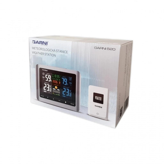 Meteorologická stanica s inverzným farebným displejom s časom a dátumom riadenými rádiovým signálom DCF-77, budíkom, meraním vnútorné teploty, relatívnej vlhkosti a absolútneho barometrického tlaku, bezdrôtovým čidlom na meranie vonkajšej teploty a relatívnej vlhkosti.