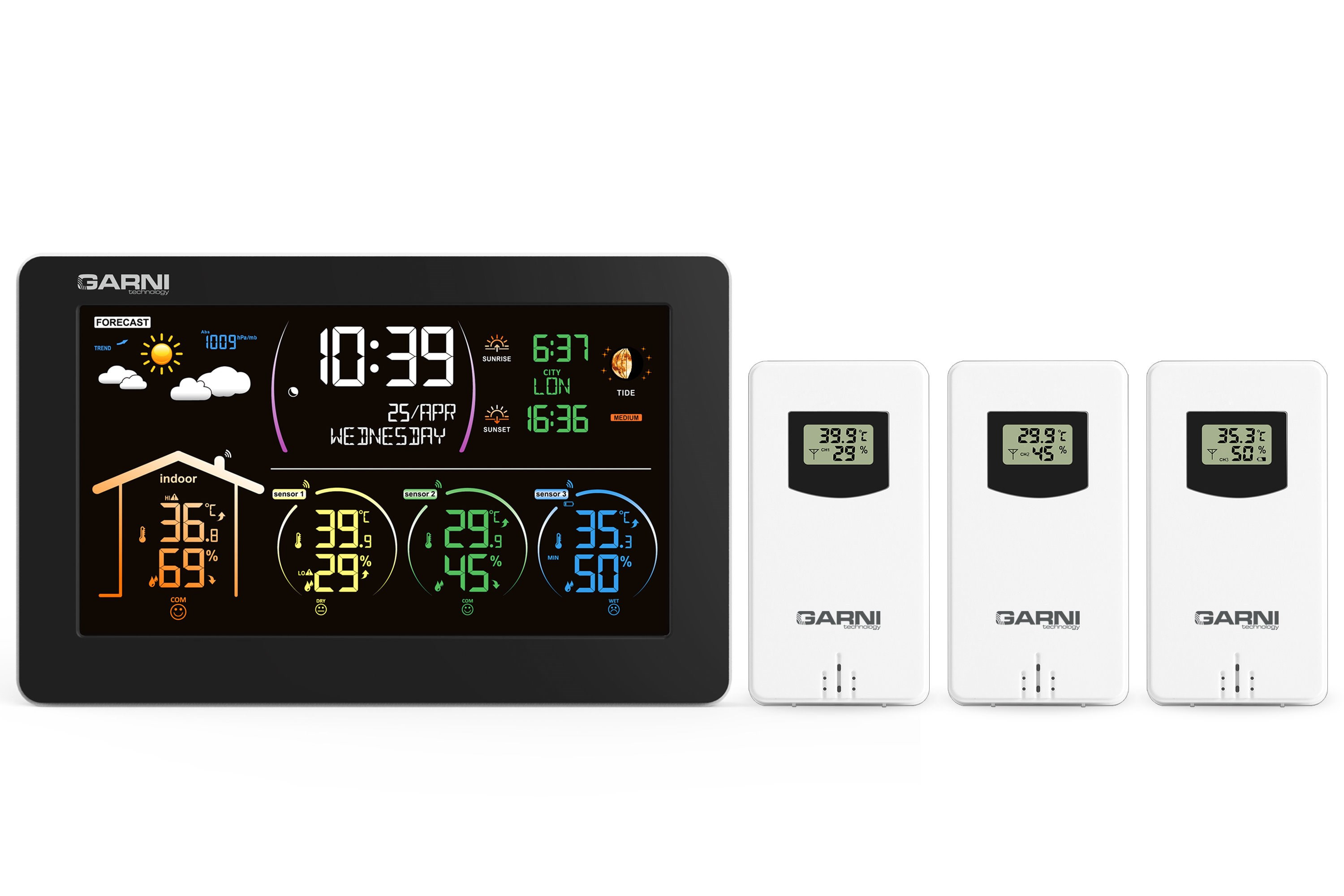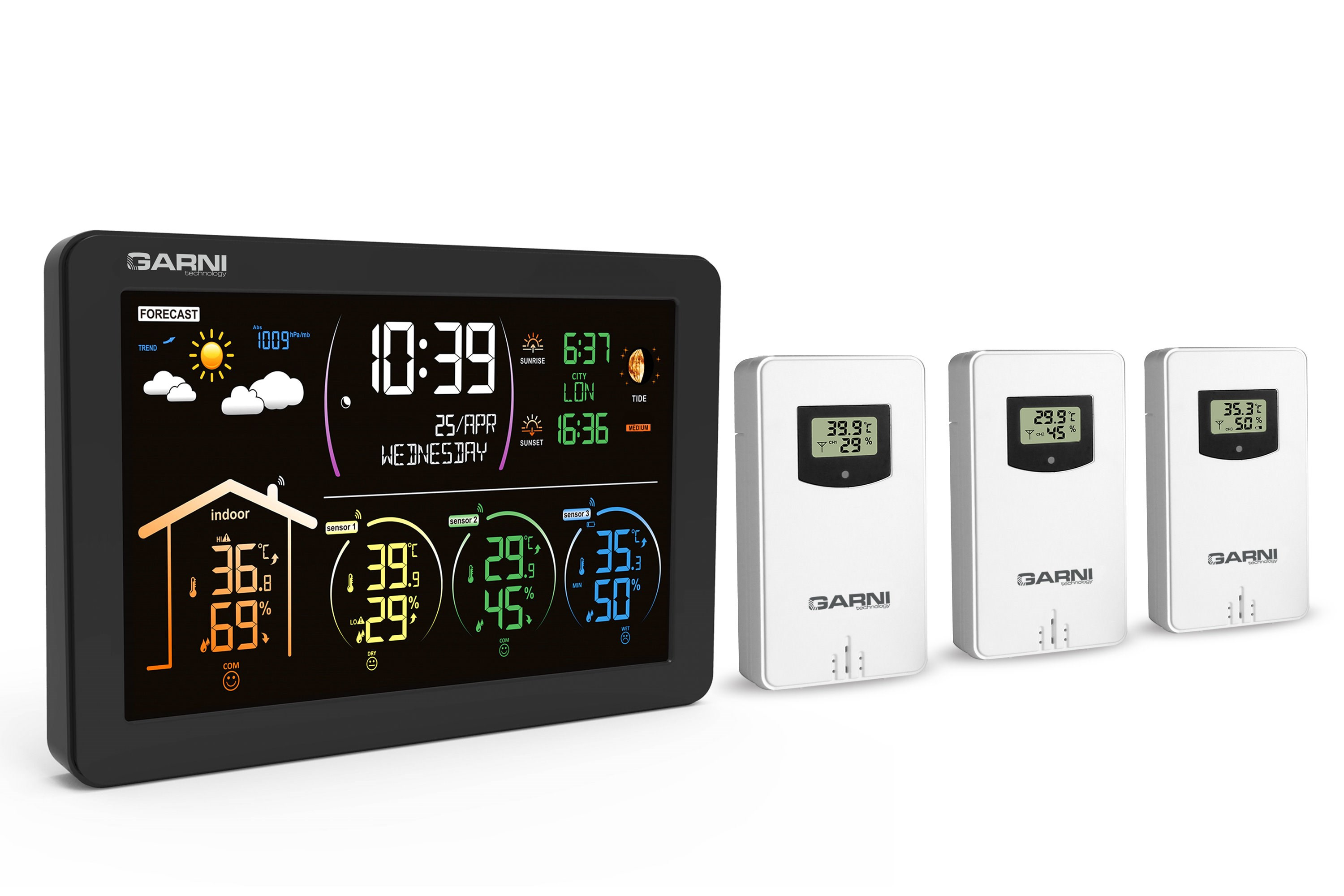 - 3 bezdrôtové senzory GARNI 030H s displejom sú súčasťou balenia