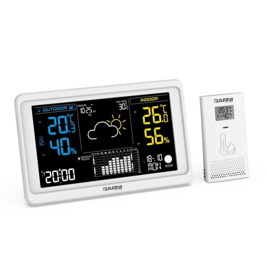 Presná meteorologická stanica s inverzným farebným VA displejom s časom a dátumom riadenými rádiovým signálom DCF-77, budíkom, meraním vnútornej teploty, relatívnej vlhkosti, barometrického tlaku a bezdrôtovým čidlom na meranie vonkajšej teploty a relatívnej vlhkosti. Pre dosiahnutie vysokej presnosti merania teploty a relatívnej vlhkosti sú použité špičkové senzory švajčiarskej značky SENSIRION