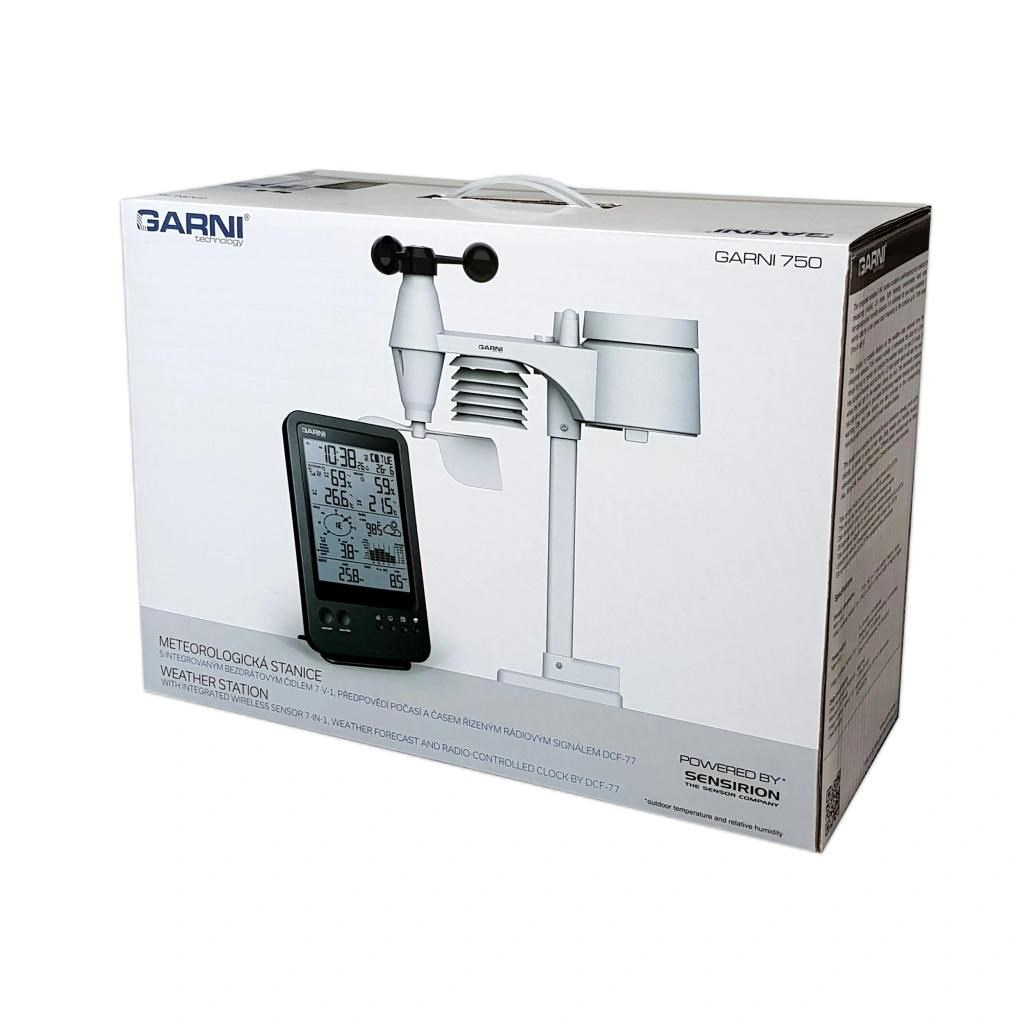 Meteorologická stanica s predpoveďou počasia, meraním vnútorných a vonkajších teplôt, relatívnej vlhkosti, barometrického tlaku, rýchlosti a smeru vetra, dažďových zrážok, UV indexu a intenzity slnečného žiarenia ? LCD displej o rozmeroch 90 x 110 mm ? možnosť krátkodobého osvetlenia displeja oranžovou farbou na 5 s ? veľkosť číslic na displeji - čas 15 mm, dátum, skratka názvu dňa 6,5 mm, vonkajšia a vnútorná teplota a relatívna vlhkosť 12,5 mm, barometrický tlak 8 mm, rýchlosť a náraz vetra 11 mm, skratka smeru vetra 5 mm, zrážky, UV index, intenzita slnečného žiarenia, pocitová teplota, Wind Chill, teplotný index, rosny bod 10 mm ? čas a dátum riadené rádiovým signálom DCF-77 s možnosťou manuálneho nastavenia ? skratka názvu dňa ? 12 alebo 24 hodinový formát zobrazenia času ? ikona príjmu signálu DCF-77 ? časová zóna +/- 23 hodín ? budík s funkciou opakovania buzenia (Snooze) ? buzenie zvukovým signálom (4 sekundy 1 pípnutie za sekundu, 4 sekundy 2 pípnutia za sekundu, 4 sekundy 3 pípnutia za sekundu a potom stále 4 pípnutia za sekundu) ? funkcia budíka Pre-alarm - budík sa aktivuje o 30 minút skôr, ak bude vonkajšia teplota nižšia než -3 °C ? fáza Mesiaca ? meranie vnútorných teplôt a relatívnej vlhkosti s ikonou tepelnej pohody ? meranie vonkajších teplôt, relatívnej vlhkosti, rýchlosti a smeru vetra, srážok, UV indexu a intenzity slnečného žiarenia integrovaným senzorom 7-v-1 ? integrovaný senzor 7-v-1 používa pre meranie teplôt a relatívnej vlhkosti švajčiarske senzory SENSIRION ? možnosť použitia ďalších 3 bezdrôtových senzorov pre meranie teplôt a relatívnej vlhkosti GARNI 055H a bazénového senzora GARNI 057P pre meranie teploty vody (voliteľné príslušenstvo) ? zobrazenie teploty vo °C alebo °F ? šípky vývoja vnútorných a vonkajších teplôt a relatívnej vlhkosti ? možnosť automatického prepínania zobrazenia vonkajšej teploty a relatívnej vlhkosti nameranej integrovaným senzorom 7-v-1 a voliteľnými pripojenými bezdrôtovými senzorami po 4 sekundách ? meranie priemernej rýchlosti vetra za posledných 12 s, nárazov vetra a smeru vetra aktuálneho a za posledných 5 minút, 16 rozlíšení smeru ? zobrazenie rýchlosti vetra v Beaufortovej stupnici ? textový popis úrovne sily vetra (LIGHT – ľahký, MODERATE – mierny, STRONG – silný, STORM – búrka) ? zobrazenie rýchlosti vetra a nárazov vetra v m/s, km/h, knots (uzle), alebo mph ? zobrazenie smeru vetra skratkou (16 skratiek), alebo vo stupňoch (360°) ? meranie dažďových srážok - aktuálne (za poslednú hodinu), hodinový úhrn, denný úhrn, týždenný úhrn, mesačný úhrn a celkový úhrn ? zobrazenie úhrnu dažďových srážok v mm alebo in (palcoch), aktuálna hodnota v mm/h alebo in/h ? 6 animovaných ikon predpovede počasia (slnečno, polooblačno, oblačno, dážď, búrky, sneženie) ? meranie barometrického tlaku, zobrazenie absolútneho alebo relatívneho barometrického tlaku ? zobrazenie hodnoty barometrického tlaku v hPa, inHg alebo mmHg ? stĺpcový graf vývoja barometrického tlaku za posledných 24 hodín ? zobrazenie hodnoty UV indexu, intenzity slnečného žiarenia, vonkajšej pocitovej teploty, Wind Chill, teplotného indexu a rosného bodu ? zobrazenie intenzity slnečného žiarenia v luxoch, fc alebo W/m2 ? možnosť kalibrácie UV indexu a intenzity slnečného žiarenia ? pamäť na namerané hodnoty vnútorných a vonkajších teplôt a vlhkostí, hodnoty barometrického tlaku, hodnoty Wind Chill, rýchlosti vetra vrátane času a dátumu merania za posledných 24 hodín po hodine ? zobrazenie maximálnych a minimálnych hodnôt vnútorných a vonkajších teplôt a relatívnej vlhkosti, pocitovej teploty, Wind Chill, teplotného indexu, rosného bodu, barometrického tlaku, maximálnej priemernej rýchlosti a nárazov vetra a maximálnych intenzít srážok, maximálneho UV indexu, maximálnej hodnoty intenzity slnečného žiarenia s časom a dátumom záznamu ? alarm horných a dolných mešien vnútorných a vonkajších teplôt a relatívnej vlhkosti vrátane ďalších senzorov ? alarm hornej meze hodinového úhrnu srážok ? alarm hornej meze rýchlosti vetra ? indikácia dosiahnutia hornej alebo dolnej meze zvukovým signálom a blikajúcou ikonou ? indikácia slabých batérií hlavnej jednotky, integrovaného bezdrôtového senzora 7-v-1 a ďalších prídavných bezdrôtových senzorov ? indikácia sily signálu integrovaného bezdrôtového senzora a prídavných senzorov ? farba čierna ? rozmery hlavnej jednotky bez stojanu 118 x 192,5 x 21 mm ? napájanie 3 ks AA batérií 1,5 V Integrované bezdrôtové senzory 7-v-1 model GARNI 6INT ? vodotesný integrovaný bezdrôtový senzor 7-v-1 (teplota, relatívna vlhkosť, rýchlosť vetra, smer vetra, dažďové zrážky, UV index, intenzita slnečného žiarenia) ? dosah signálu integrovaného bezdrôtového senzora až 150 m v otvorenom priestore ? prenos signálu na frekvencii 868 MHz ? vodováha ? radiačný štít ? farba svetlosivá, misky rýchlosti vetra čierne ? rozmery 343,5 x 393,5 x 136 mm ? napájanie 3 ks AA batérií 1,5 V Obsah balenia: 1 x hlavná jednotka 1 x integrované bezdrôtové senzory 7-v-1 1 x stojan hlavnej jednotky 1 x montážna základňa integrovaného bezdrôtového senzora 1 x stojan integrovaného bezdrôtového senzora 1 x montážna objímka integrovaného bezdrôtového senzora 4 x dlhší skrutka, 4 x matice, 4 x ploché podložky, 2 x kratšie skrutky, 2 x menšie matice, 2 x gumové podložky český, slovenský, anglický, nemecký, holandský, poľský a maďarský návod