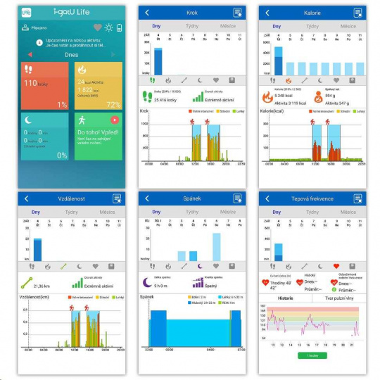 - na hlavnej obrazovke aplikácie je zobrazený prehľad nameraných hodnôt, ako je počet krokov, spálené kalórie, doba spánku, športový režim a aktuálna tepová frekvencia (ak je meranie aktivované). Možnosť merania tepovej frekvencie celý deň aj v spánku. Kliknutím na jednotlivé položky zobrazíte podrobný graf (okrem merania tepovej frekvencie)