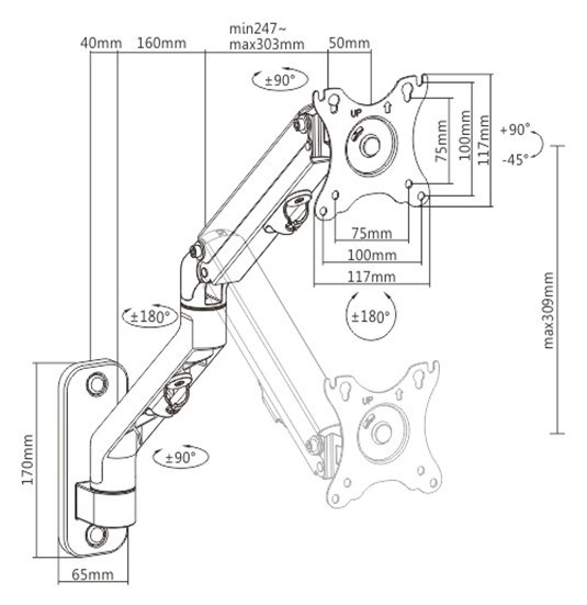 - Odolné nastaviteľné plynové pružiny vhodné pre monitory 2 - 7 kg