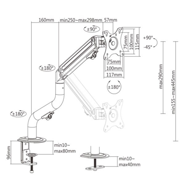 - Odolné nastaviteľné plynové pružiny vhodné pre monitory 2 - 8 kg