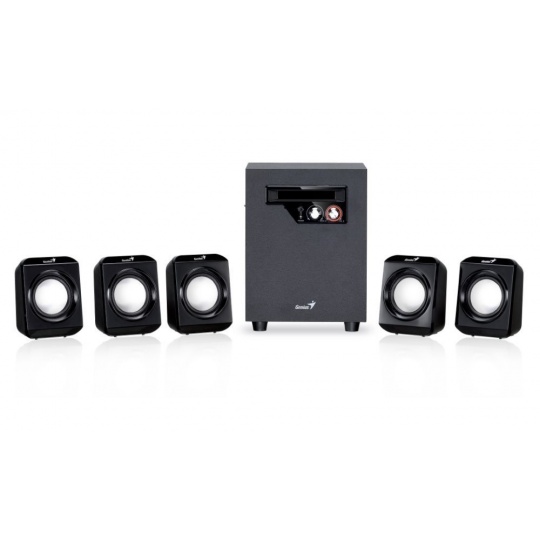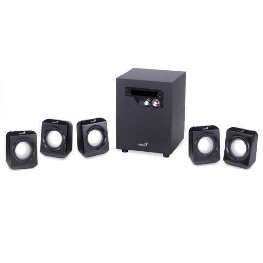 Elegantný systém reproduktorov v konfigurácii 5reproduktorov.1 ponúka celkový výkon 26 W. Zostava pozostáva z vysokokvalitného subwoofera so 4" meničom, ktorý poskytuje výkon 14,5 W RMS a dodáva verné a plné basové tóny. Subwoofer dopĺňa päť satelitov, každý s výkonom 2,3 W RMS. Ovládanie hlasitosti a basov sa nachádza na prednej strane subwoofera. Balenie obsahuje napájací adaptér 100-240 V.