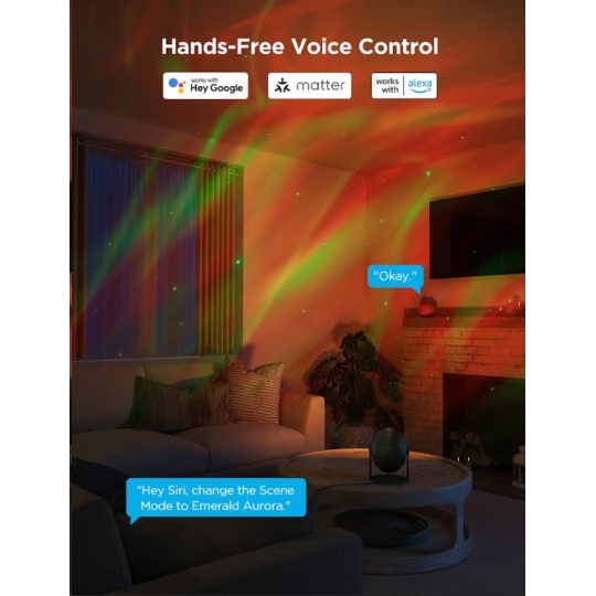 Projektor ponúka jednoduché ovládanie prostredníctvom aplikácie Govee Home, kde si môžete vyberať z niekoľkých prednastavených režimov alebo vytvárať vlastné svetelné kombinácie. Navyše je kompatibilný s hlasovými asistentmi, ako je Amazon Alexa a Google Assistant, čo vám umožňuje ovládať projekciu aj pomocou hlasových príkazov. Vďaka tejto chytrej technológii môžete pohodlne prepínať medzi rôznymi svetelnými scénami alebo meniť farby, aniž by ste museli vstávať z pohovky. Vďaka protokolu Matter sa môže integrovať aj do HomeKitu.