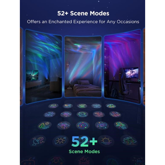 Govee Star Light Projector ponúka viac než 52 prednastavených scén a výkonný DIY režim, ktorý vám umožní nezávisle ovládať laserovú hviezdnu projekciu aj LED mlhovinu. Môžete kombinovať farby, efekty a intenzitu svetla podľa svojich predstáv, čím vytvoríte unikátne a personalizované svetelná šou. Či už túžite po pokojnej relaxačnej atmosfére alebo dynamickom vizuálnom zážitku, DIY režim vám poskytne plnú tvorivú kontrolu.