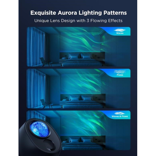 Govee Star Light Projector prináša pôsobivé mlhovinové vzory, ktoré môžu mať tvar vĺn, plynulých prúdov alebo ich kombinácie, čím vytvárajú dynamickú a fascinujúcu svetelnú šou. Vlnové vzory pridávajú jemný pohyb a pocit pokoja, zatiaľ čo prúdové efekty pridávajú energickejší a plynulejší dojem. Kombinácia oboch štýlov následne vytvára mimoriadne komplexnú a atraktívnu projekciu, ktorá prinesie do vášho priestoru harmóniu aj živost. Tieto variácie mlhoviny vám umožnia prispôsobiť osvetlenie presne podľa atmosféry, ktorú chcete vytvoriť.