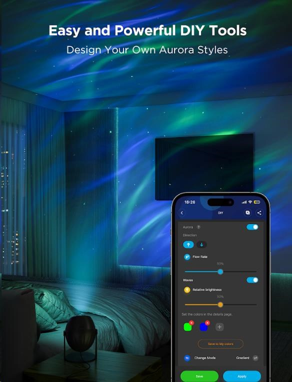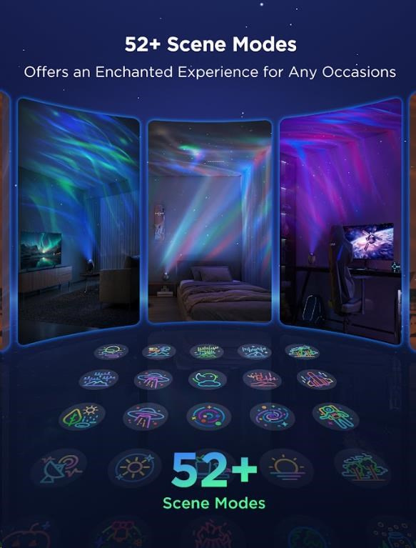 Govee Star Light Projector ponúka viac než 52 prednastavených scén a výkonný DIY režim, ktorý vám umožní nezávisle ovládať laserovú hviezdnu projekciu aj LED mlhovinu. Môžete kombinovať farby, efekty a intenzitu svetla podľa svojich predstáv, čím vytvoríte unikátne a personalizované svetelná šou. Či už túžite po pokojnej relaxačnej atmosfére alebo dynamickom vizuálnom zážitku, DIY režim vám poskytne plnú tvorivú kontrolu.