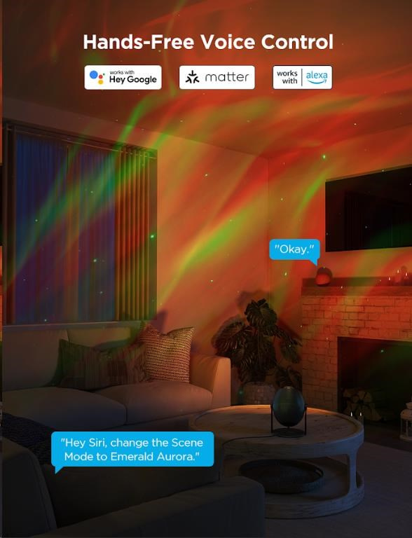 Projektor ponúka jednoduché ovládanie prostredníctvom aplikácie Govee Home, kde si môžete vyberať z niekoľkých prednastavených režimov alebo vytvárať vlastné svetelné kombinácie. Navyše je kompatibilný s hlasovými asistentmi, ako je Amazon Alexa a Google Assistant, čo vám umožňuje ovládať projekciu aj pomocou hlasových príkazov. Vďaka tejto chytrej technológii môžete pohodlne prepínať medzi rôznymi svetelnými scénami alebo meniť farby, aniž by ste museli vstávať z pohovky. Vďaka protokolu Matter sa môže integrovať aj do HomeKitu.