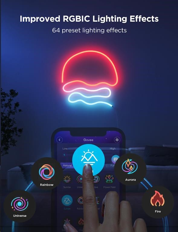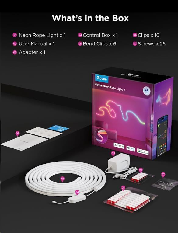 Govee prináša 2. generáciu svojich neonových pásikov. Pripravte sa na rad zásadných zlepšení. Vaše gamingové, pracovné alebo relaxačné prostredie dostaneNovú dávku energie s Govee Neon 2. Tieto dizajnové pásky sú teraz mäkšie, takže tvarovanie je jednoduchšie. Hotové tvary je možné pomocou priloženého materiálu umiestniť na ľubovoľný povrch a pomocou aplikácie a fotoaparátu si tvar do aplikácie preniesť. Na vytvorený vzor môžete namapovať 16,4 mil. farieb a aplikovať množstvo efektov. 3m pásik sa skladá zo 252 diód, čo dáva hustotu 84 LED/m. Príkon páska je 36 W pri plnom výkone a životnosť je 50.000 hodín. Vďaka technológii RGBIC je možné pásik priradiť až 57 farieb naraz v intenzite 1-100 %. Pre zákazníkov, ktorí uprednostnia prednastavené režimy, pásky ponúkajú 64 svetelných scén a 12 spôsobov visualizácie hudby. Vyberie si každý. Neon 2 sa ovláda aplikáciou a je možné využiť aj asistentov, Google, Alexa a Siri. Zcela nová, pásky podporujú protokol Matter, takže integrácia do väčšiny Smart Home prostredia je otázka niekoľkých sekúnd. Inštalácia pásikov sa vykonáva pomocou priložených klipov, vybavených silnou, obojstrannou 3M páskou, bez práce s vrtaním. Na inštaláciu je nutný pevný povrch, pri upevnení na omietku nie je možné pevnosť spojenia garantovať.