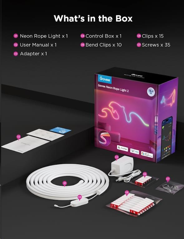 Inštalácia je veľmi jednoduchá pomocou samolepících klipov s 3M páskami. Nová generácia neonových pásikov je ešte ohybnejšia a tvarovanie je tak jednoduchšie. Vylepšené boli aj klipy a ponúkajú teraz pevnejšiu fixáciu vymysleného tvaru. Pre možnosť maximálnej istoty sú v balení aj šroubky. Govee Neon 2 je vhodné pre všetky miestnosti a fantázii sa medze nekladú!