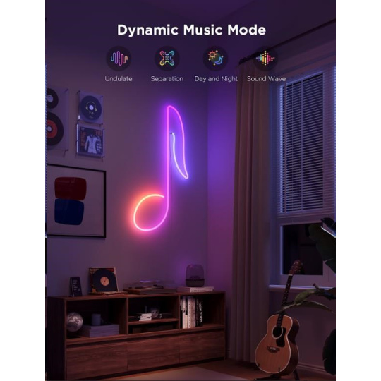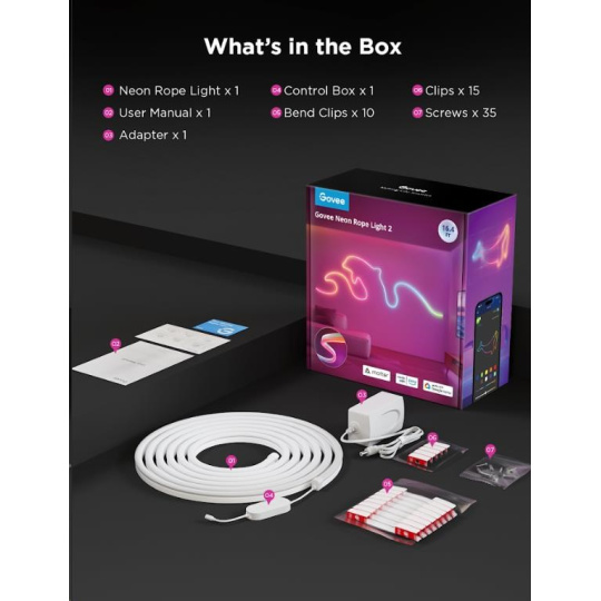 Inštalácia je veľmi jednoduchá pomocou samolepících klipov s 3M páskami. Nová generácia neonových pásikov je ešte ohybnejšia a tvarovanie je tak jednoduchšie. Vylepšené boli aj klipy a ponúkajú teraz pevnejšiu fixáciu vymysleného tvaru. Pre možnosť maximálnej istoty sú v balení aj šroubky. Govee Neon 2 je vhodné pre všetky miestnosti a fantázii sa medze nekladú!