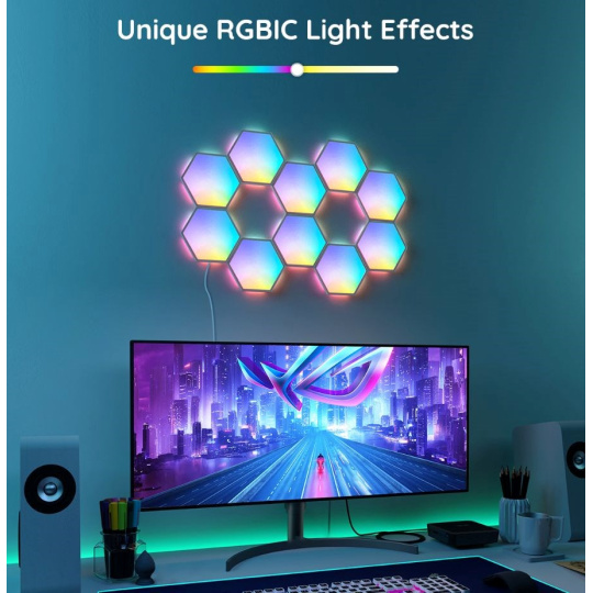 Govee Hexa ponúka 38 rôznych režimov na dokonalé naladenie svetelnej atmosféry. Govee technológia RGBIC dokáže zobraziť až 57 farieb naraz z celkovej škály 16 miliónov farieb pri intenzite 1-100%. Môže sa tiež pochváliť životnosťou až 50.000 hodín.