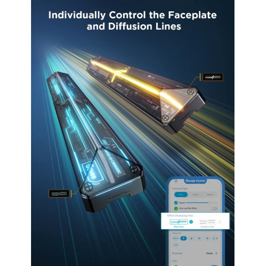 Tieto svetlá poskytujú množstvo dizajnových možností. Panel je možné rozdeliť na samostatné farebné segmenty, kombinovať priame a rozptýlené svetlo, pridávať efekty, meniť smer toku svetla a mnoho ďalších. Aplikácia Govee Home je nástroj pre kompletnú kontrolu svetla.