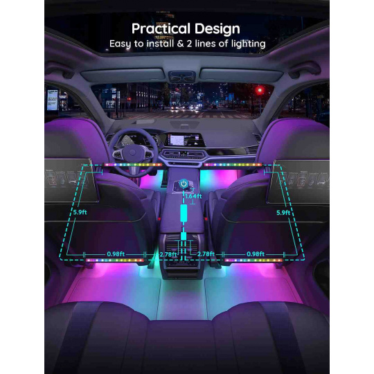 Energeticky úsporný interiér inteligentné LED pásiky Govee Smart RGBIC pre autá so životnosťou až 50 000 hodín vylepšia interiér vášho auta a poskytnú zážitok, ktorý sa vyskytuje v luxusných autách. Môžete ich použiť prakticky kdekoľvek, kde je zapaľovanie. Zobrazuje až 16 miliónov farieb, ktorých intenzitu je možné nastaviť od 1 do 100 %. Vďaka technológii RGBIC môžete pásik rozdeliť na samostatné segmenty, pre ktoré si potom môžete vybrať rôzne farby. Vyberte si z 30 režimov svietenia a svetlá sa synchronizujú pri počúvaní obľúbenej hudby. Alebo si jednoducho nastavte vlastné farebné kombinácie v režime DIY. Príkazy môžete zadávať prostredníctvom aplikácie Govee Home na svojom smartfóne alebo tablete alebo priamo na Control Boxe. Inštalácia je jednoduchá a je rozdelená na prednú a zadnú časť vozidla.