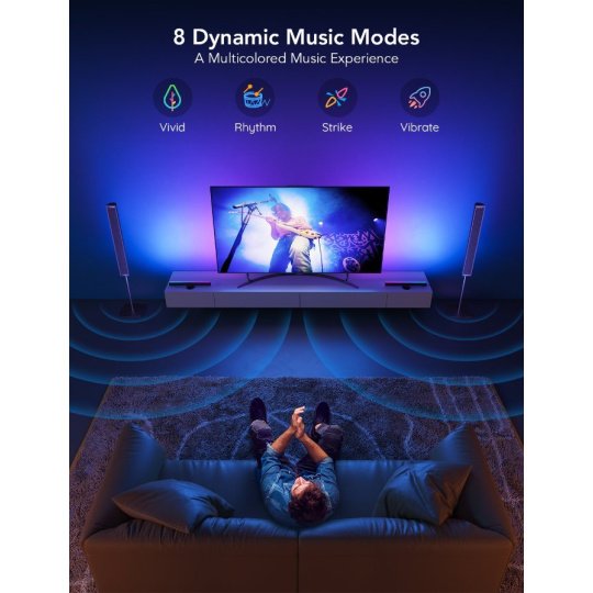 Vyberte si z 8 hudobných režimov. Vďaka vstavanému mikrofónu sa svetelné panely hladko synchronizujú s vašou hudbou alebo atmosférickými zvukmi vydávanými z vašej televízie alebo počítača pri sledovaní filmov alebo hraní hier.