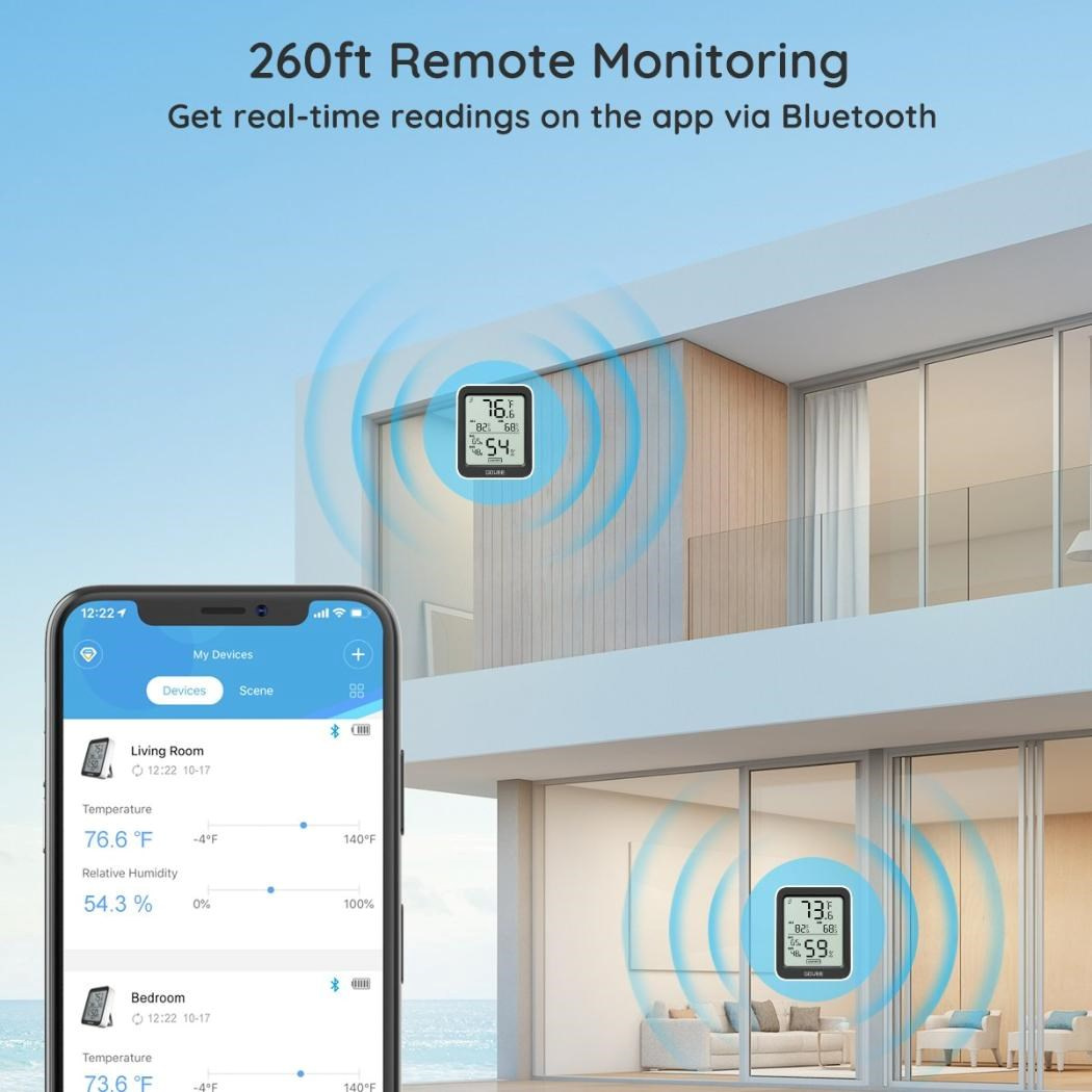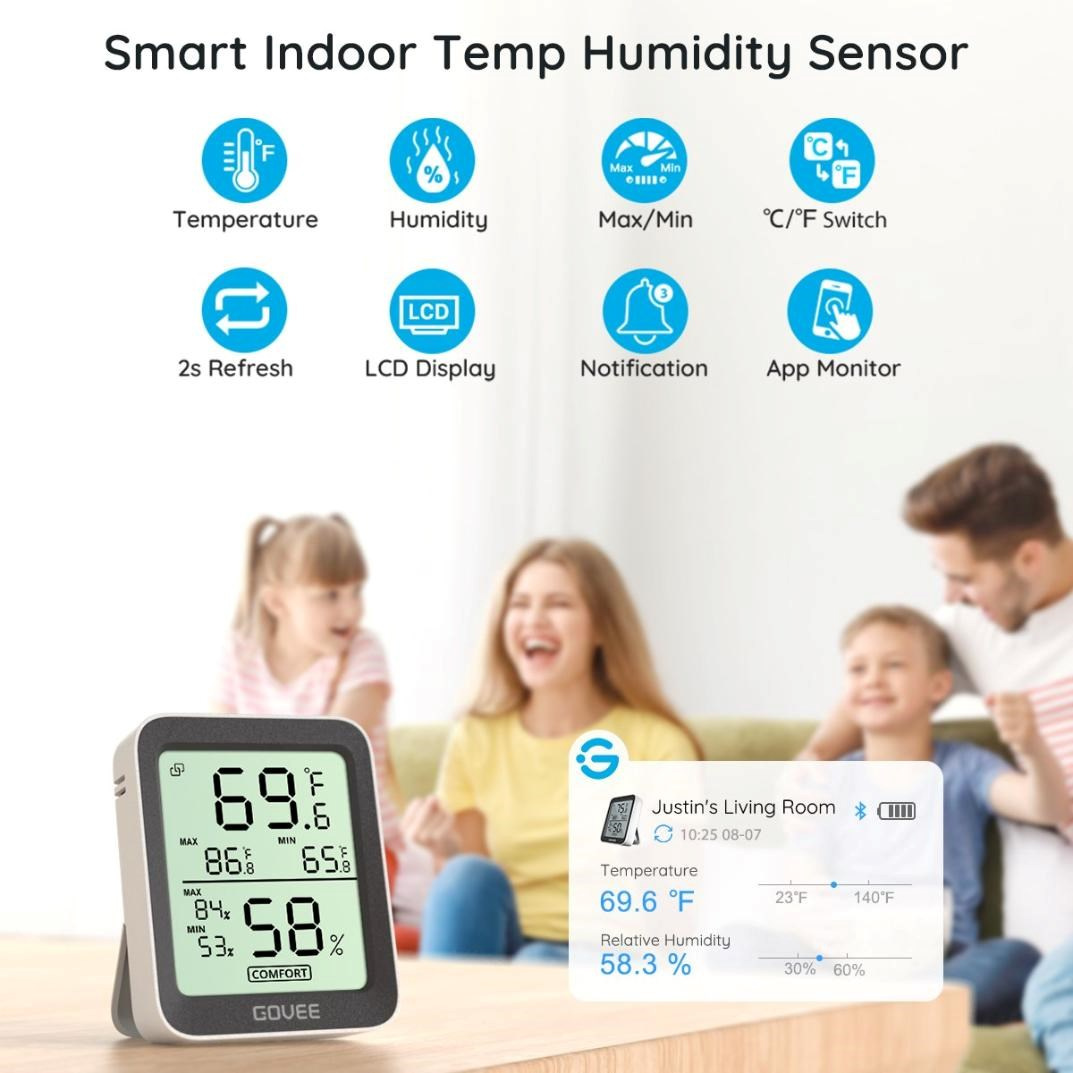 Udržujte svoje vnútorné prostredie príjemné a zdravé. Inteligentný monitor teploty a vlhkosti od Govee. Tento kompaktný, ale výkonný klimatický monitor zobrazuje aktuálnu teplotu a vlhkosť na prehľadnom LCD displeji a vďaka Bluetooth pripojeniu k vášmu telefónu máte svoje údaje vždy poruke. Vďaka vysoko presným senzorom (±0,3 °C pre teplotu a ±3 % RH pre vlhkosť) môžete ľahko sledovať zmeny v akejkoľvek miestnosti, kancelárii alebo skleníku.