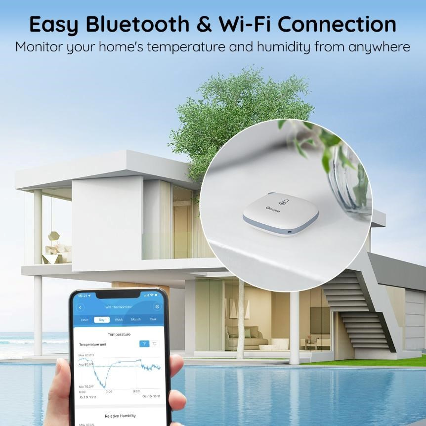 Vďaka kombinácii Wi-Fi a Bluetooth konektivity máte svoje namerané údaje vždy pod kontrolou, či už ste doma alebo mimo domova. V aplikácii Govee Home môžete sledovať teplotu a vlhkosť v reálnom čase priamo na svojom telefóne. Pohodlné vzdialené monitorovanie vám umožňuje rýchlo reagovať na zmeny v prostredí odkiaľkoľvek.