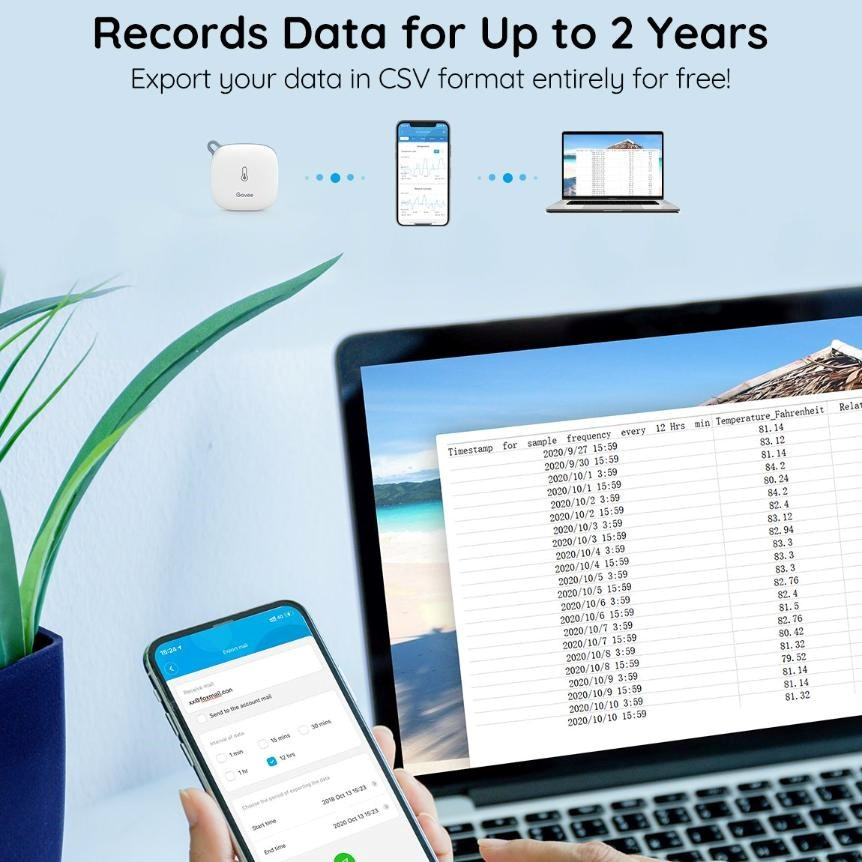 Vďaka okamžitým upozorneniam v aplikácii Govee Home môžete sledovať, kedy teplota alebo vlhkosť prekročí nastavené limity. To je ideálne na ochranu rastlín, vína, domácich zvierat alebo citlivých elektronických zariadení, kde sú dôležité stabilné podmienky. Zariadenie vám tiež umožňuje ukladať a exportovať namerané údaje až po dobu 2 rokov, čo uľahčuje sledovanie trendov v čase a hodnotenie zmien v prostredí. Tým získate realistický prehľad o vývoji klímy v čase, nielen o aktuálnych hodnotách. To všetko je zabalené v malom, ľahkom a prenosnom dizajne, ktorý sa dá ľahko umiestniť kdekoľvek bez toho, aby zaberal miesto.