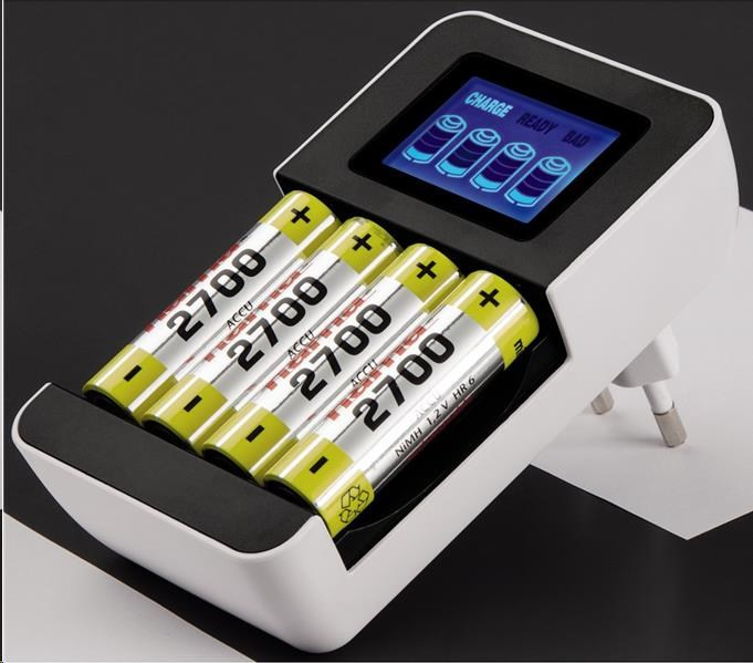 - zásuvková nabíjačka pre 1-4 NiMH akumulátory AA (mignon) alebo AAA (micro) - 4 individuálne nabíjacie sloty, každý akumulátor je monitorovaný a nabíjaný samostatne (možnosť nabíjania akumulátorov rôzneho typu a kapacity súčasne) - LCD displej s grafickým zobrazením priebehu nabíjania - nabíjanie riadené mikroprocesorom (ochrana proti prebitiu a prehriatiu akumulátorov) - automatické ukončenie nabíjania pomocou detekcie Delta-U - bezpečnostná časová poistka - detekcia vadných akumulátorov - ochrana proti nesprávnej polarite Technické parametre: - typ nabíjačky: automatická - konštrukcia nabíjačky: zásuvková (integrovaná sieťová vidlica) - typ akumulátorov: NiMH, veľkosť AA (R6) mignon/AAA (R03) micro - nabíjací prúd: 450 mA (AA)/200 mA (AAA) - napájanie: 100-240 V/50 Hz - farba: čierna/biela
