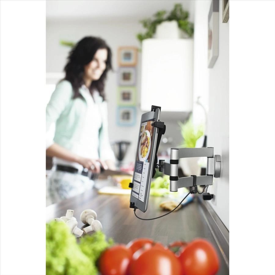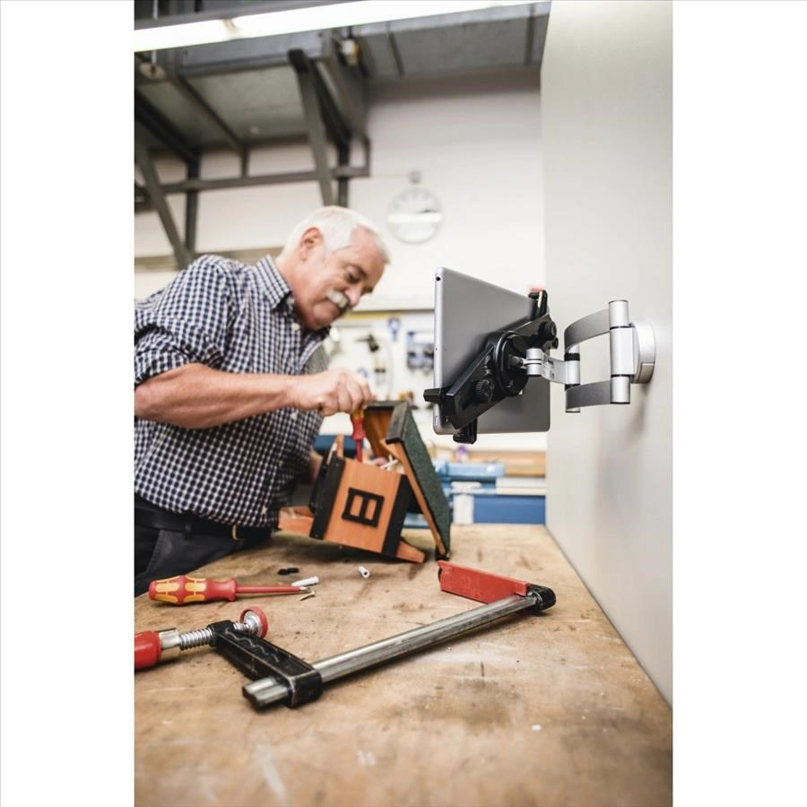 - držiak tabletu pre rýchly a ľahký prístup k zariadeniu - pre zariadenia s uhlopriečkou 7"-11" (17,8-27,9 cm), výškou od 11 cm do 18 cm a so šírkou od 19 cm do 28 cm - možnosť otáčania pre individuálne nastavenie polohy zariadenia - možnosť naklopenia hore/dole - montáž na stenu pomocou skrutiek a hmoždiniek - nastaviteľné čeľuste pre prispôsobenie konkrétnemu zariadeniu a bezpečné upevnenie zariadenia - vysoko kvalitný, stabilný, hliníkový držiak s jednoduchým dizajnom - vhodný pre kancelárie, kuchyne, detské izby - maximálne zaťaženie: 1 kg - materiál: hliník/plast - farba: čierna/strieborná - súčasťou balenia je montážny materiál Obsah balenia: - nástenný držiak na tablet - montážny materiál - návod na použitie.