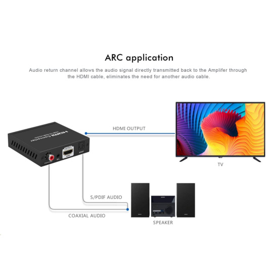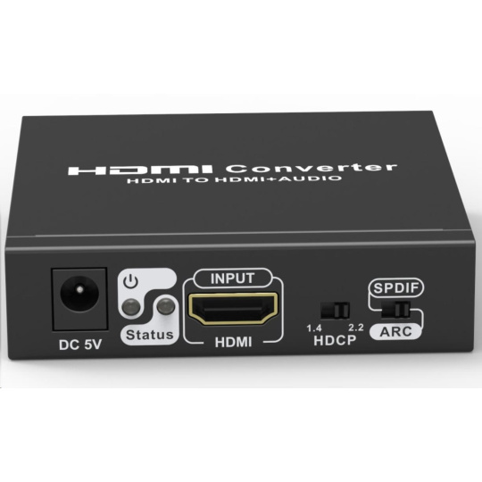 Umožňuje oddelenie zvuku z HDMI2.0 vstup na analógový/digitálny zvuk, ktorý je samostatne vyvedený do konektorov: stereo jack, digitálny audio RCA CINCH alebo digitálny optický TOSLINK (SPDIF)