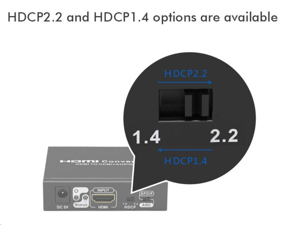 - umožňuje pripojenie zariadení s rôznou verziou HDCP 2.2 a HDCP1.4 , na tento účel je k dispozícii nastaviteľný prepínač