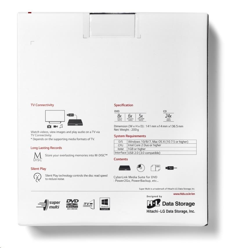 HITACHI LG - externá mechanika DVD-W/CD-RW/DVD±R/±RW/RAM GP57EW40, Slim, biela, krabica+SW