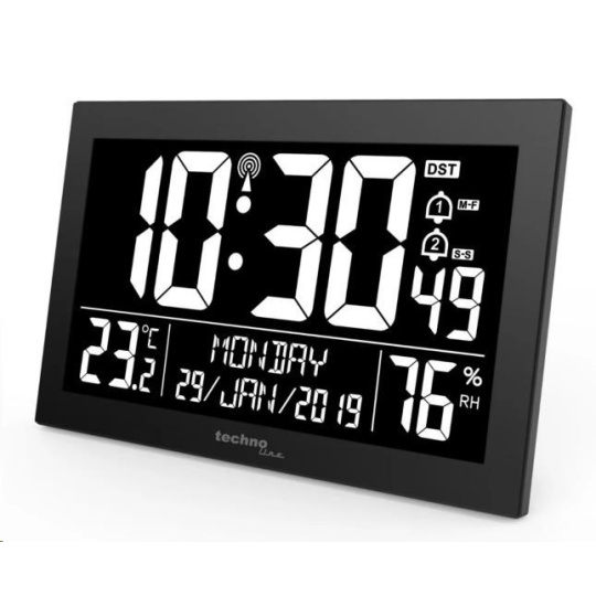 Digitálne nástenné hodiny s dvoma budíkmi s inverzným LCD displejom, časom riadeným rádiovým signálom DCF-77 a meraním vnútornej teploty a relatívnej vlhkosti • nástenné hodiny s možnosťou postavenia • veľkosť inverzného displeja 110 x 194 mm • čas riadený rádiovým signálom DCF-77 • formát zobrazenia času 12, alebo 24 hodín • dátum s názvom dňa (jazyk EN, DE, FR, IT, ES, NL a DK) • 2 budíky - pre pracovné dni a víkend • funkcia opakovanej budenia (Snooze) s nastaviteľným časom od 5 do 60 minút • budenie zvukovým signálom (20 sekúnd 1 pípnutie za sekundu, potom 20 sekúnd 2 pípnutia za sekundu, potom 20 sekúnd 4 pípnutia za sekundu a potom stály píp) • dátum • časová zóna od -2 do +2 hodín • meranie vnútornej teploty a relatívnej vlhkosti • ikona slabých záložných batérií • napájanie na sieťový adaptér a záložné batérie • farba čierna