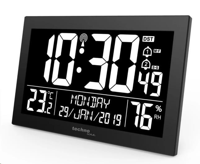 Digitálne nástenné hodiny s dvoma budíkmi s inverzným LCD displejom, časom riadeným rádiovým signálom DCF-77 a meraním vnútornej teploty a relatívnej vlhkosti • nástenné hodiny s možnosťou postavenia • veľkosť inverzného displeja 110 x 194 mm • čas riadený rádiovým signálom DCF-77 • formát zobrazenia času 12, alebo 24 hodín • dátum s názvom dňa (jazyk EN, DE, FR, IT, ES, NL a DK) • 2 budíky - pre pracovné dni a víkend • funkcia opakovanej budenia (Snooze) s nastaviteľným časom od 5 do 60 minút • budenie zvukovým signálom (20 sekúnd 1 pípnutie za sekundu, potom 20 sekúnd 2 pípnutia za sekundu, potom 20 sekúnd 4 pípnutia za sekundu a potom stály píp) • dátum • časová zóna od -2 do +2 hodín • meranie vnútornej teploty a relatívnej vlhkosti • ikona slabých záložných batérií • napájanie na sieťový adaptér a záložné batérie • farba čierna