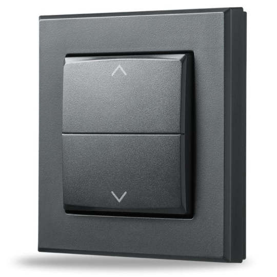 Kryt kolébkového vypínača so symbolmi šípok a rámečkom v antracitovej farbe (HmIP-BRA-A) pre programovateľné bezdrôtové akčné členy (HmIP-BRC2, HmIP-BROLL, HmIP-BBL, HmIP-BSM, HmIP-BDT) o veľkosti 55 mm je súčasťou systému inteligentnej domácnosti Homematic IP.