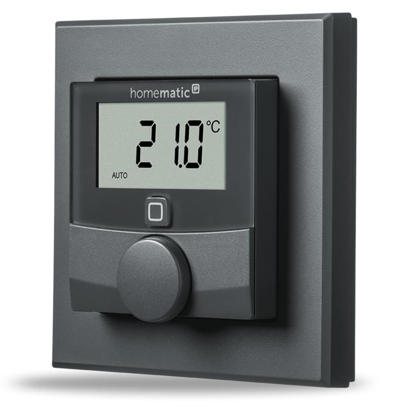 Jednou z takýchto zariadení je aj bezdrôtový Nástenný termostat so senzorom vlhkosti v antracitovej farbe (HmIP-WTH-A) z radu Homematic IP s podsvieteným LED displejom o veľkosti 1,74" pre zobrazenie teploty a vlhkosti, predstavujúci inteligentný spôsob regulácie vykurovania a úspory energií.