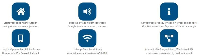 | Ovládanie pomocou mobilnej aplikácie Homematic IP s česky lokalizáciou | Zabezpečená bezdrôtová komunikácia s šifrovaním AES-128 | Modulárne riešenie, voliteľne rozšíriteľné o ďalšie komponenty systému chytrej domácnosti |