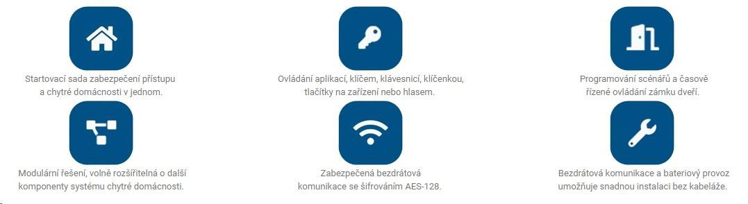 | Štartovacia sada riadenia vykurovania a inteligentnej domácnosti v jednom | Ovládanie aplikáciami, kľúčom, klávesnicou, kľúčenkou, tlačidlami na zariadení alebo hlasom | Programovanie scén a časovo riadené ovládanie zámku dverí |