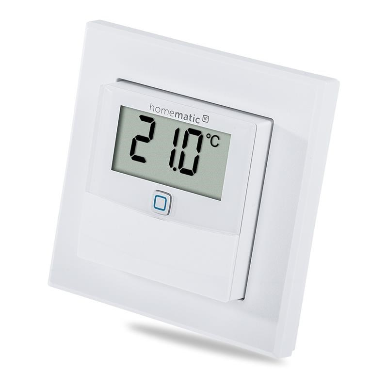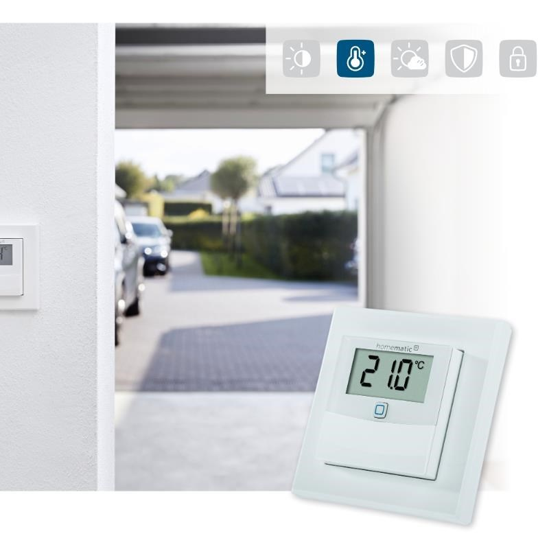 Bezdrôtový nástenný Senzor teploty a vlhkosti (HmIP-STHD) s LED displejom o veľkosti 1,74" (4,4 cm) pre zobrazenie aktuálnych informácií predstavuje inteligentný spôsob pre reguláciu vykurovania a úsporu energií.