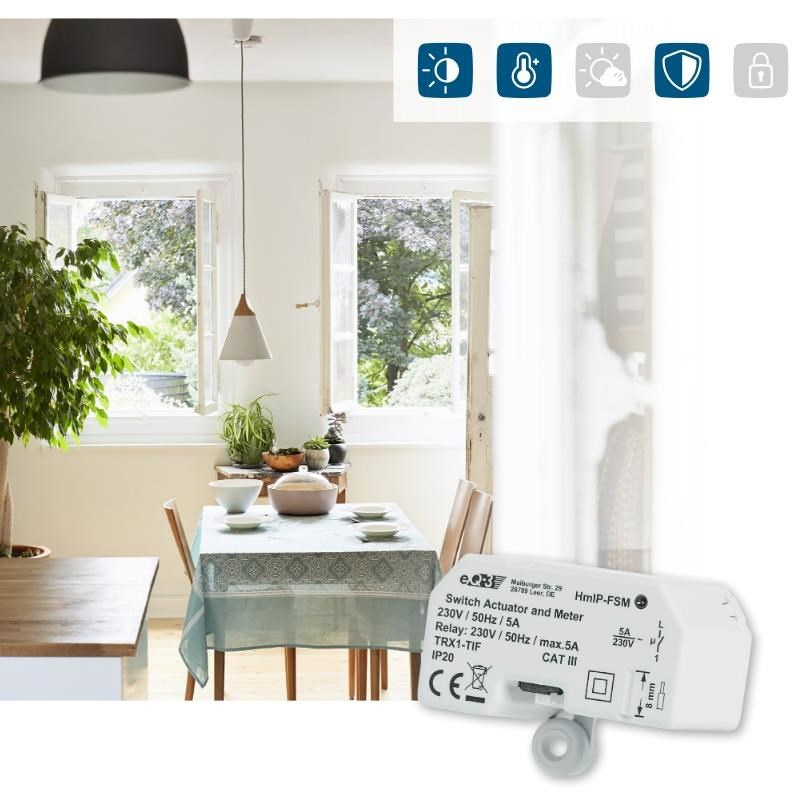 Programovateľný bezdrôtový Spínací akčný člen s meraním (HmIP-FSM) pre skrytú montáž, napájaný zo siete 230 V, je súčasťou systému inteligentnej domácnosti Homematic IP.