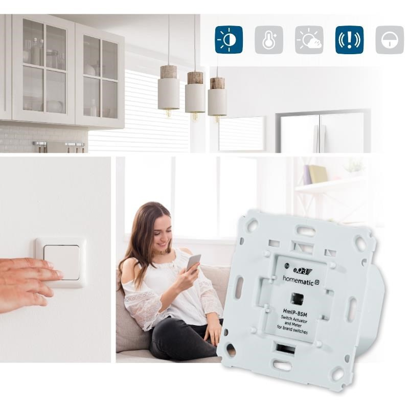 Programovateľný bezdrôtový Spínací akčný člen s meraním (HmIP-BSM-I) pre zápustnú montáž, napájaný zo siete 230 V, je súčasťou systému chytrej domácnosti Homematic IP.