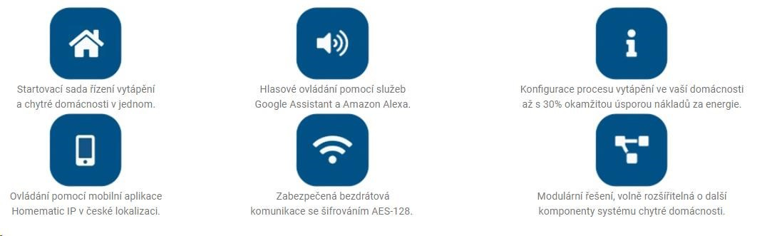 Startovacia sada pre riadenie vykurovania HmIP-SET4 určená na počiatočnú integráciu inteligentnej domácnosti Homematic IP. Sada obsahuje tri základné prvky pre spoľahlivé riešenie regulácie vykurovania a vzdialené riadenie priestorovej teploty v miestnosti podľa individuálnych potrieb, čo vedie k okamžitej úspore a zníženiu výdavkov na energie až o 30 %. Sada obsahuje Centrálnu jednotku HmIP-HAP, 2x Termostatickú hlavicu HmIP-eTRV-E a bezplatnú mobilnú aplikáciu v CZ lokalizácii dostupnú pre operačný systém Android a iOS.
