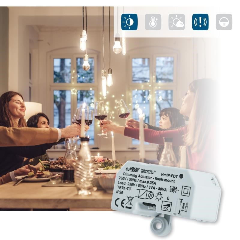 Programovateľný bezdrôtový Stmievací akčný člen (HmIP-FDT) pre skrytú montáž, napájaný zo siete 230 V, je súčasťou systému inteligentnej domácnosti Homematic IP.