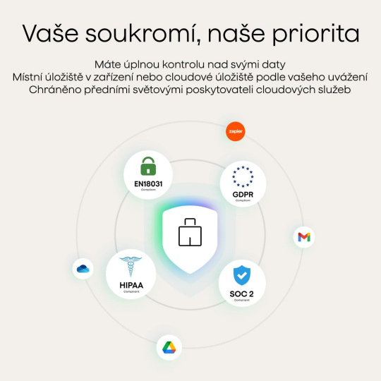 Plaud kladie maximálny dôraz na bezpečnosť vašich dát. Používa hosting iba na serveroch Amazon AWS. Navyše sú rekordéry certifikované na súlad s auditným štandardom SOC2, zdravotníckym štandardom na zaobchádzanie s citlivými dátami pacientov HIPAA, celoeurópskym nariadením o ochrane osobných údajov GDPR a normou EN18031, pre kybernetickú bezpečnosť.