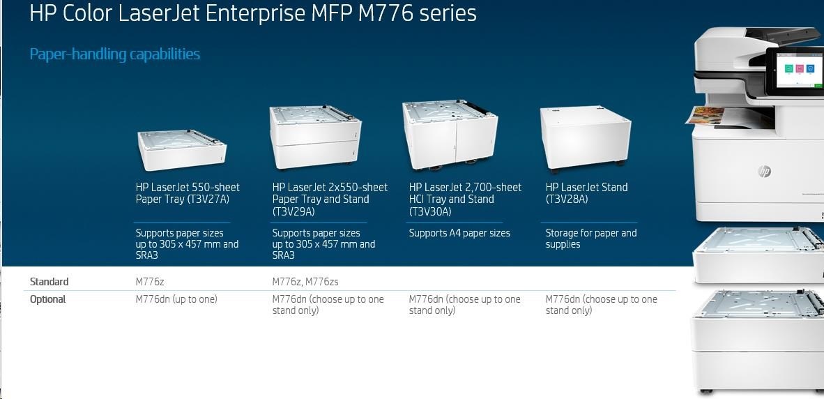 | Vstupná manipulácia s papierom, štandardná | Viacúčelový zásobník na 100 hárkov; Zásobník papiera na 1 x 550 hárkov; Zásobník papiera a stojan na 2 x 550 hárkov |