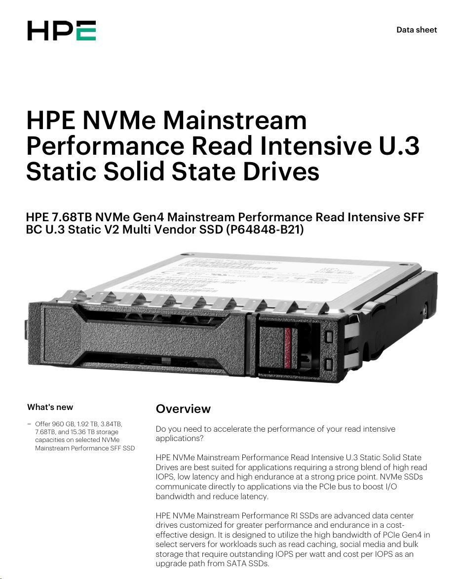 HPE 7.68TB NVMe Gen4 Mainstream Performance Read Intensive SFF BC U.3 Static V2 Multi Vendor SSD P64848-B21 RENEW.