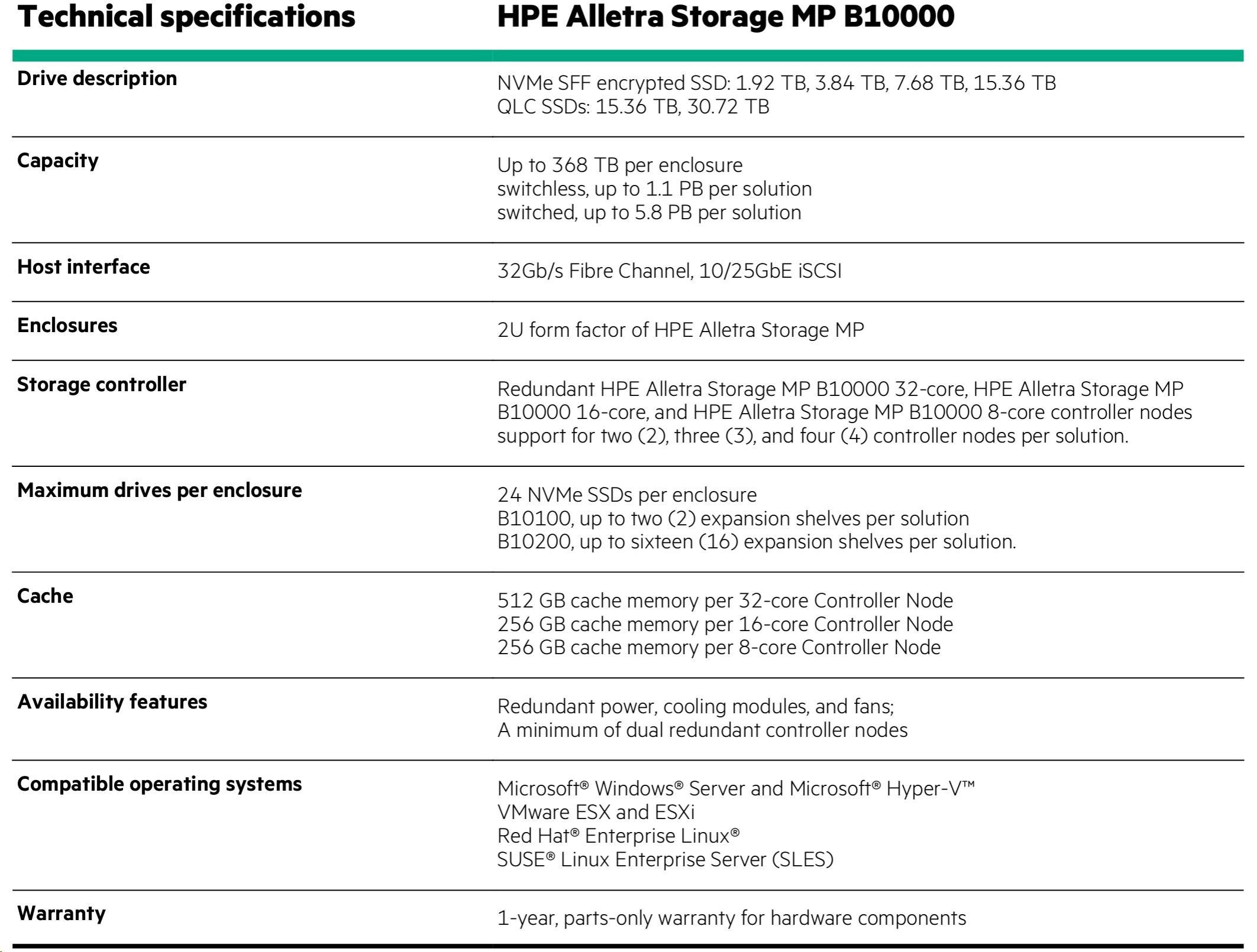 Žádné kompletní výměny: Díky programu HPE Timeless Storage pro HPE Alletra Storage MP B10000 můžete chránit své investice a udržovat úložiště neustále aktuální pomocí aktualizace řadiče bez přerušení provozu. Tím se sníží vaše celkové náklady na vlastnictví a ušetříte v průměru 30 % oproti tradičním kompletním výměnám. Neustále se zlepšující datové služby: Využijte plný potenciál HPE Alletra Storage MP B10000 s naším komplexním předplatným softwaru. Získejte přístup ke všem funkcím a vylepšením našeho operačního systému, včetně cloudových operací řízených umělou inteligencí v cloudu HPE GreenLake, bez dalších nákladů. Spolehněte se na 100% dostupnost dat – zaručeno: Zapomeňte na přerušení provozu způsobená neočekávanými výpadky. HPE Alletra Storage MP B10000 je platforma řízená umělou inteligencí, rozdělená a bez jediného bodu selhání, která zaručuje odolnou 100% dostupnost dat pro každého zákazníka a každé pole. Ukládejte více za méně s HPE StoreMore Guarantee: To zaručuje celkovou úsporu minimálně 4:1 pro vaše pracovní zatížení – snížení nákladů na fyzické úložiště, úsporu energie a zmenšení stopy datového centra. 30denní záruka spokojenosti: Vyzkoušejte HPE Alletra Storage MP B10000 po dobu 30 dnů bez rizika. Pokud nebudete zcela spokojeni s výhodami a schopnostmi vašeho úložného systému, jak jsou popsány v produktových specifikacích, budeme s vámi spolupracovat na nápravě.
