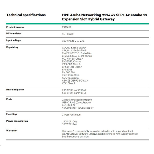 HPE Aruba Networking 9114 4x SFP+ 4x Combo 1x Expansion Slot Hybrid Gateway.