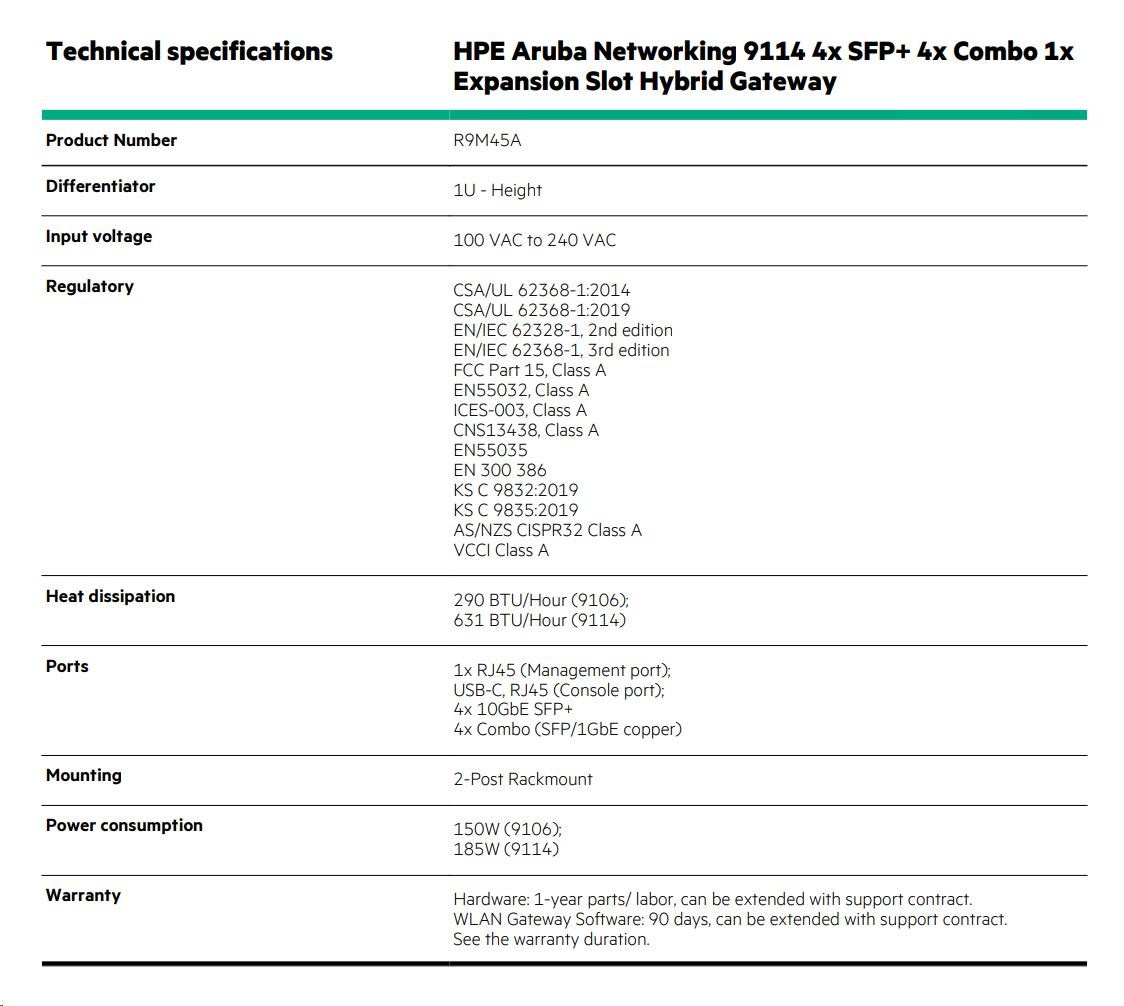 HPE Aruba Networking 9114 4x SFP+ 4x Combo 1x Expansion Slot Hybrid Gateway