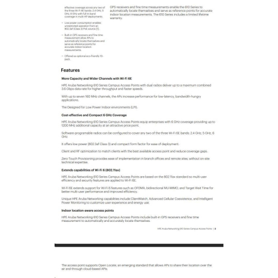 | Summary Aruba 610 Series Access Points are designed to take advantage of the 6 GHz band using two radios that can deliver comprehensive tri-band coverage in a multi-AP environment and better meet the growing demands of Wi-Fi due to increased use of video, growth in client and IoT devices, and expanded use of cloud. With a 3.6 Gbps combined peak data rate for higher throughput and faster speeds for indoor use, the Aruba 610 Series delivers a cost-effective enterprise Wi-Fi 6E solution with increased capacity, wider channels, reduced power consumption. |